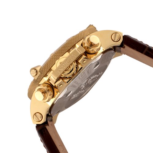 Pairing a distinctive style with high-quality craftsmanship, the Invicta Women's Subaqua Collection Noma III Watch features a brown, mother-of-pearl dial with prominent gold-toned hands, nine diamond studs for hour indexes, and a date display at the four o'clock position. Two of the three chronograph subdials have golden edges while a handy tachymeter is inscribed on the outer perimeter. This unique dial is surrounded by an 18k gold-plated, stainless steel bezel, and the watch features gold-plated, screw-down pushers and a protective cap on the crown. The stainless steel case provides strength while a durable flame-fusion crystal offers ultimate scratch resistance. The elegant, brown leather watch strap is secured with a buckle clasp. This luxurious watch offers precise Swiss quartz movement and is water resistant to an impressive 1640 feet (500 meters).