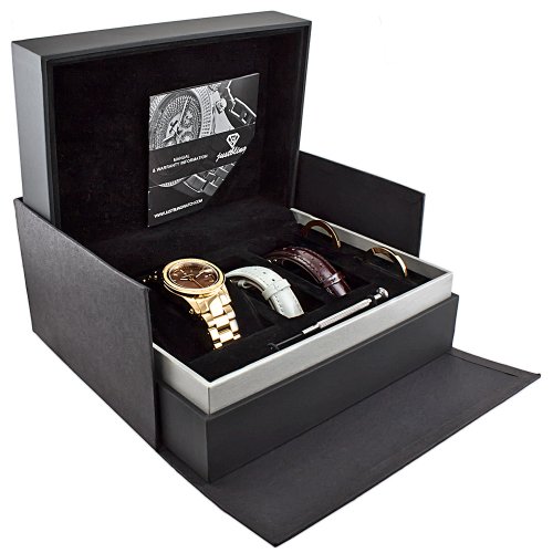 The "Starlight Gold" gift set possess an opulent array of choices on an already stunningly feminine watch. The 18K gold plated stainless steel case includes a matching bezel with .20 CTW of genuine diamond accents; this bezel is interchangeable and can be replaced with a classic 18K gold plated stainless steel bezel or an 18K gold plated bezel with a chic brown enamel ring. The brown Mother of Pearl dial features gold hour markers, a date function, and contrasting luminescent hands for easy and precise timekeeping. This versatile watch comes with am 18K gold plated stainless steel three-link band and deployment clasp, and with this exclusive JBW gift set one isn't limited to a stainless steel band! Included is a watchband-changing tool so that you can easily switch out the bands to best suit your mood, occasion, or season! A cream and a brown genuine leather band and buckle accompany this gift set, making this the perfect watch for any classy and trendy lady.